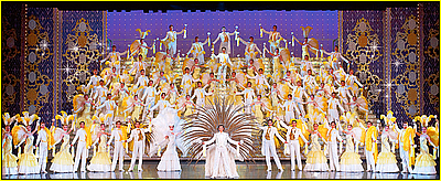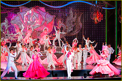 The plays are very varied, but they are almost always musicals with a hour long revue afterwards, and if not, at least a short revue-like finale (after longer play). The revues are the art form of itself, designed to make the viewer feel even more amazement after the experience. The costumes are rich and glittery, there are a lot of dancers on stage and the big, splendid finale with feathers and luminous stairs.